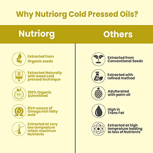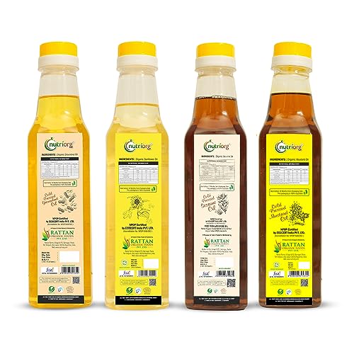 Review For Nutriorg Cold-Pressed USDA Certified Organic Mustard Oil & Sesame Oil & Sunflower Oil & Groundnut Oil (Pack of 4) -Organic Mustard OilOrganic Sesame OilOrganic Sunflower OilOrganic Groundnut OilPure Vegetarian Product Rich color, aroma & flavor of seeds No toxic chemicals Good Source of MUFA Promotes Heart HealthI have tried many brand oils but always felt the aroma is missing which all these oils have and quality not pure as we get in villages, so I thought to try Nutriorg Cold-Pressed oil first time, and it is totally amazing.We use all these oils for cooking & the whole family loves these oils.Recommended to All for best quality & taste