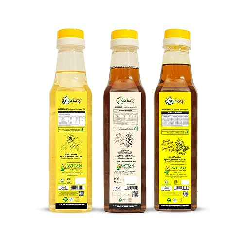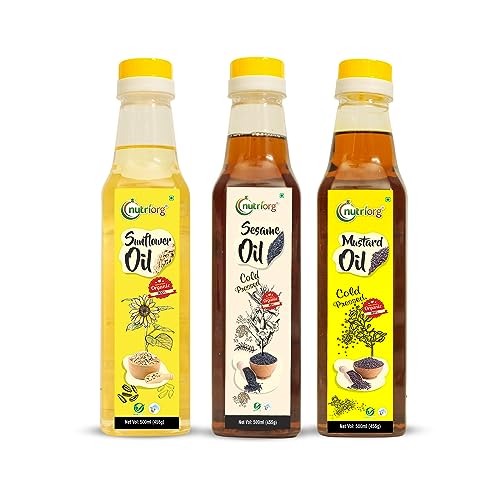 Nutriorg Organic Mustard, Sesame & Sunflower Oil (Pack of 3* 500 ml) | Cold Pressed | Wooden Pressed | Essential Cooking Purpose | Unrefined | Natural Filtration for Nutrients Retention| Hair & Skin Care