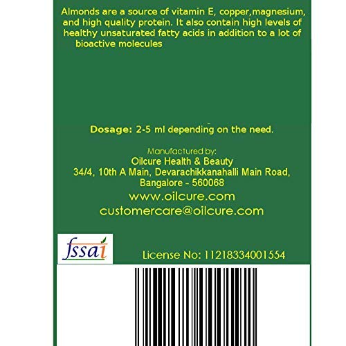 Oilcure Edible Cold Pressed Almond oil is filled with a variety of nutrients. It is rich in vitamin E copper magnesium and high-quality protein. It is good for brains cholesterol heart bone health. It is also good for skincare and hair care as well.