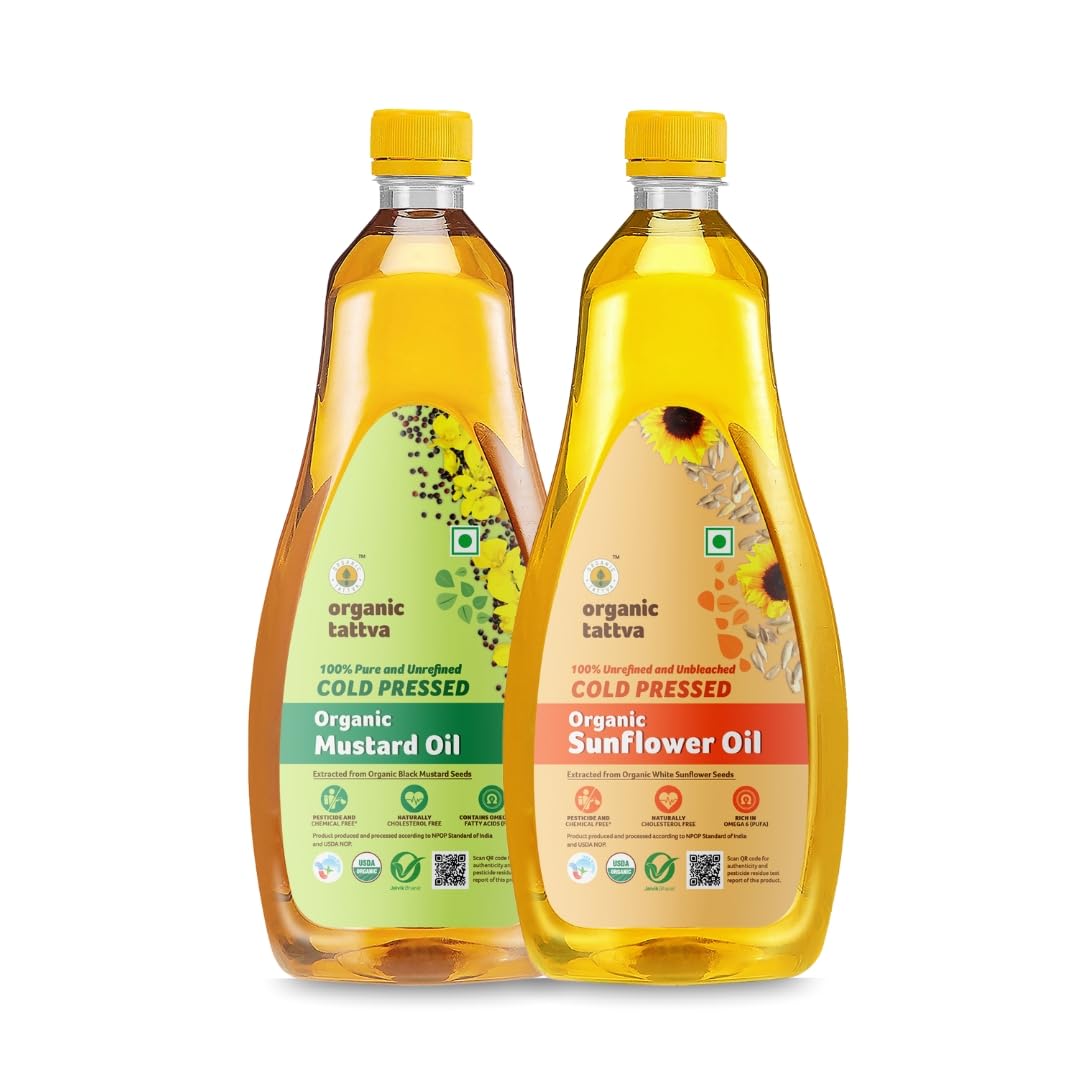 Organic Tattva's Organic Mustard and Sunflower Oil are extracted from naturally developed mustard and sunflower seeds respectively. Being engaged with a characteristic interaction it holds all its unique constituents and properties. It is utilized as a sound substitute for cooking oils. Organic Tattva's Organic Edible Oils are rich wellspring of iron and different supplements.