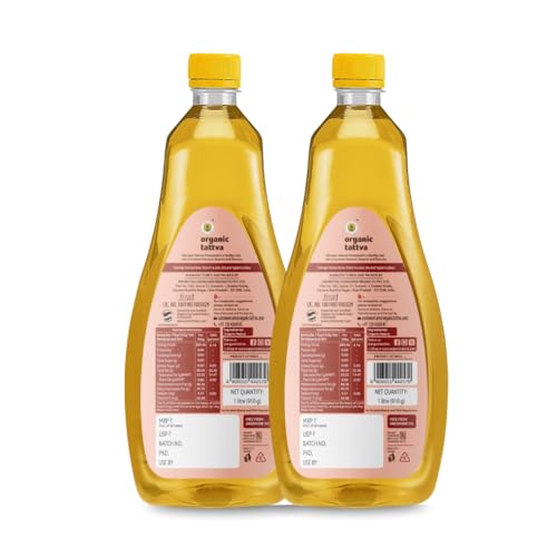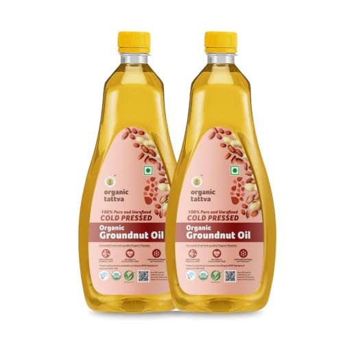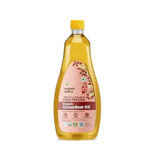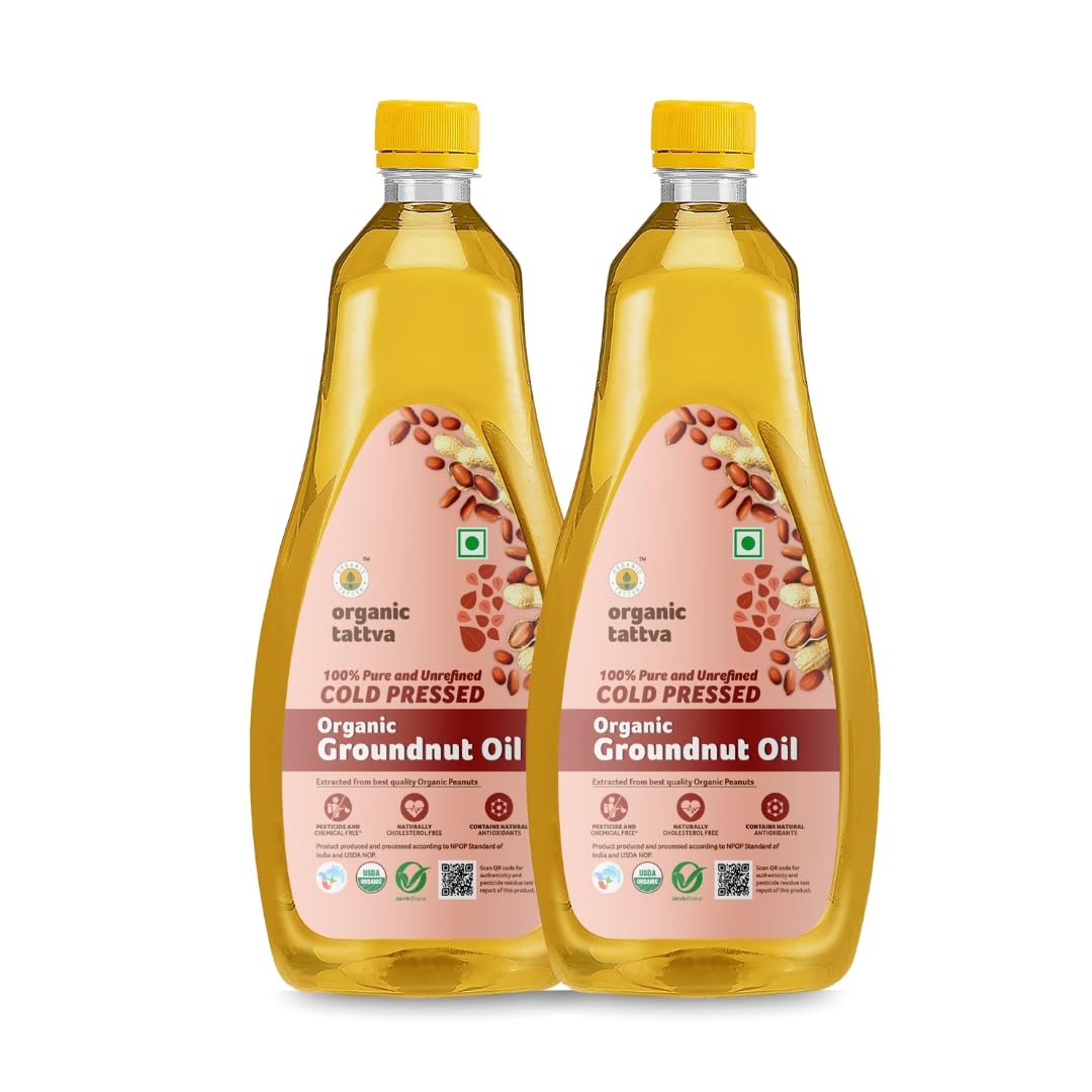 Organic Peanut oil also referred to as groundnut oil or arachis oil is a vegetable-derived oil made from the edible seeds of the peanut plant. Organic Groundnut / Peanut oil contains phytochemicals and vitamin E both of which are natural antioxidants. It helps in reducing inflammation if consumed regularly. The vitamin E naturally present in peanut oil helps to maintain good skin health making it look young and healthy. Groundnut Oils Raising a toast to healthy living! (Mono-unsaturated Fatty Acids) that lowers the level of bad cholesterol in our body without lowering the levels of good cholesterol. The oil is also low in saturated fats and high in unsaturated fats with a good percentage of monounsaturated and omega 6 fatty acids Organic Groundnut / Peanut oil is extracted from harvested shelled and crushed groundnuts (peanuts). Groundnut/Peanut oil has been very popular as a cooking medium in India. Unlike refined oil they are not exposed to high temperatures and there is no chemical added. Organic Tattva's Organic Pressed Groundnut / Peanut oil is obtained by pressing groundnuts/peanuts. Organic Tattva's Organic pressed groundnut oil is deep yellow with pleasant nutty aroma and flavourful taste with high energy. This oil has a high smoke point which makes this oil suitable for deep-frying food items. Peanut oil is low in saturated fats free from cholesterol contains essential fatty acid (linoleic acid (omega 6)) making it as one of the healthiest cooking oils.