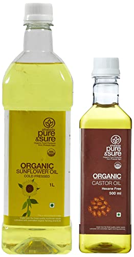 Pure & Sure Organic Sunflower Oil | Sunflower Oil for Cooking | High in Antioxidants Delicious & Healthy Sunflower Cooking Oil (1 Litre)Phalada Pure and sure is a range of certified organic food products stemmed from our aim of providing complete solutions across organic supply chain. By offering end consumers quality organic food products which are sourced directly from farmers we make sure our involvement in the supply chain from farm to hands. Our products guarantee purity and reach your hands without the use of chemical fertilizers additives or artificial ingredients. We go one step further to satisfy our customers: In areas where our supplies are limited we source premium organic products from across the globe and deliver a complete range of pure products that sure serves you the best. By sowing our vision we harvest quality and spread healthy organic practices.Pure & Sure Organic Castor Oil 500ml | Hexane Free Castor Oil | Castor Oil Cold Pressed Edible | Castor Oil for HairMade from the finest quality castor seeds sourced from certified organic farms across India phalada pure & sure Organic Castor Oil is a natural emollient that is also known for its laxative properties.