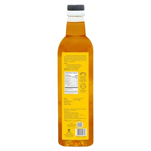 Made from the finest organic white sesame seeds our Organic Cold Pressed Sesame Oil is chemical and pesticide-free. A reservoir of healthy fats this oil has a distinct nutty flavour and a dense taste that has traditionally blended beautifully with all cuisines of the world. This Organic Sesame Oil is cold-pressed to preserve all its nutrition. It is great for cooking medicinal and cosmetic purposes. Anti-inflammatory and antioxidant this oil is bubbling with unsaturated fatty acids that are good for the heart skin joints and blood pressure. It can also be applied to improve hair and scalp health and control premature greying of hair.