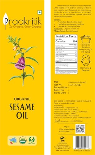 Praakritik Organic Sesame Oil 1L - Gingelly Oil | Unrefined Til ka Tel 1L