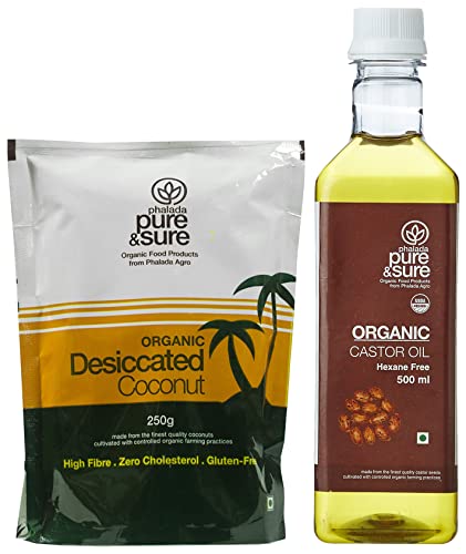 Pure & Sure Organic Castor Oil 500ml | Hexane Free Castor Oil | Castor Oil Cold Pressed Edible | Castor Oil for HairMade from the finest quality castor seeds sourced from certified organic farms across India phalada pure & sure Organic Castor Oil is a natural emollient that is also known for its laxative properties.Phalada Pure & Sure Organic Desiccated Coconut Powder 250 GMSMade from the finest quality products cultivated with controlled organic practices.