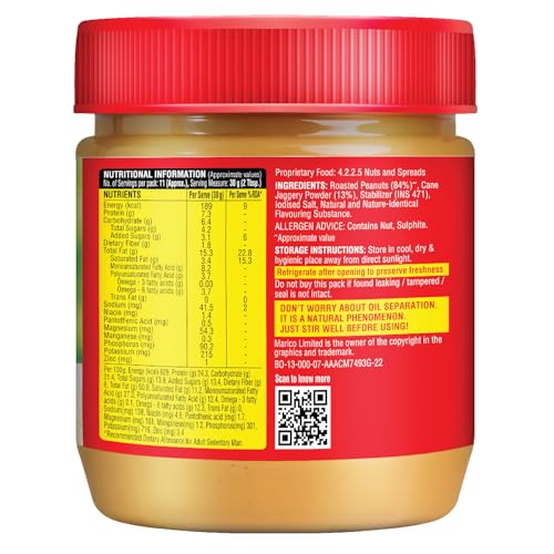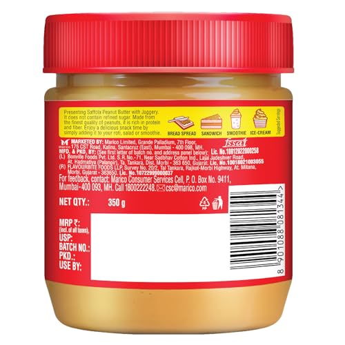 The trusted household brand Saffola brings to you this high protein Peanut Butter. Saffola Peanut Butter is made from the finest quality of farm picked Peanuts and 100% real jaggery. It does not contain any Refined Sugar and is instead enriched with the goodness of jaggery. It brings back the age-old tradition of peanuts and jaggery in the form of a healthy and tasty spread. It is a rich source of protein. Protein also known as the building block of body tissues helps in the growth and development of bones and muscle mass in children. Saffola peanut butter Creamy is an ideal option for conscious mothers who want to provide a protein rich mealtime to their kids. One serving (30g) of Saffola Peanut Butter gives 7.3g of protein similar to one glass of milk (6.5g) and one whole egg (6.6g). This lip-smacking spread can be added to roti bread smoothie or salad to make each of them Tasty and Healthy. Enjoy this Peanut Butter and make your mealtime healthylicious!