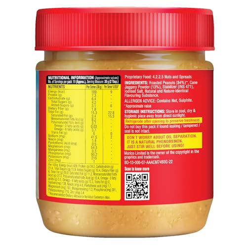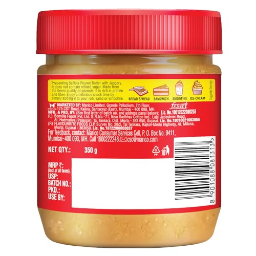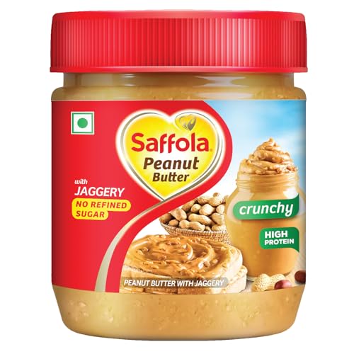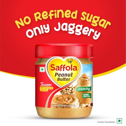 The trusted household brand Saffola brings to you this high protein Peanut Butter. Saffola Peanut Butter is made from the finest quality of farm picked Peanuts and 100% real jaggery. It does not contain any Refined Sugar and is instead enriched with the goodness of jaggery. It brings back the age-old tradition of peanuts and jaggery in the form of a healthy and tasty spread. It is a rich source of protein. Protein also known as the building block of body tissues helps in the growth and development of bones and muscle mass in children. Saffola peanut butter Creamy is an ideal option for conscious mothers who want to provide a protein rich mealtime to their kids. One serving (30g) of Saffola Peanut Butter gives 7.3g of protein similar to one glass of milk (6.5g) and one whole egg (6.6g). This lip-smacking spread can be added to roti bread smoothie or salad to make each of them Tasty and Healthy. Enjoy this Peanut Butter and make your mealtime healthylicious!