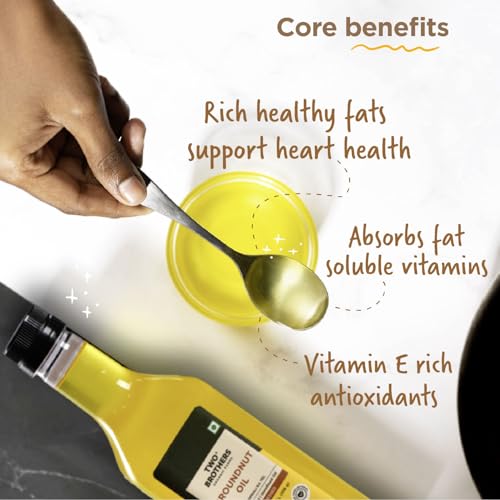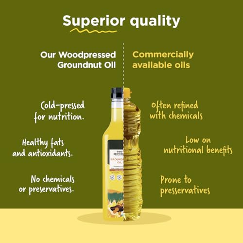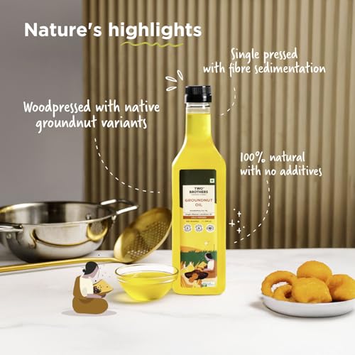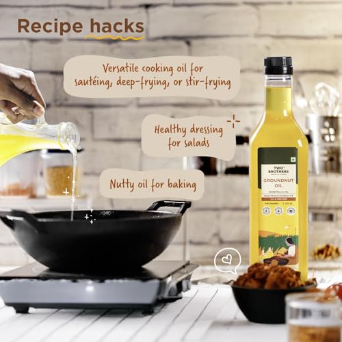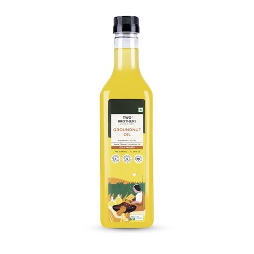 Two Brothers Organic Farms Groundnut Oil Made using farm grown Groundnuts | Cold-Pressed and Single-Filtered Oil for healthier Cooking | Kacchi Ghani/Mara Chekku Natural and Unrefined 1 Litre