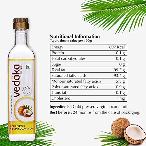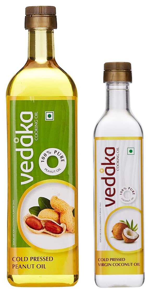 Vedaka Cold Pressed Peanut (Groundnut) Oil 1l (Ghani)Vedaka Cold pressed Groundnut Oil is extracted from premium quality peanuts. It has undergone Fatty Acid Profiling to ensure 100% purity and no adulteration. The oil is a good source of monounsaturated fats (MUFA).Decreasing saturated fatty acids and increasing Monounsaturated fatty acids in diet helps maintaining a healthy heart and normal cholesterol levels. The oil has been hygienically packaged in anti-spillage bottles to avoid leaks during transits. The bottle design allows for both ease of cooking and storage. Vedaka Cold pressed Sesame oil is your companion in making tasty nutritious food everyday. The house of Vedaka your trusted kitchen companion for pulses spices and more now offers a range of Refined Canola & Mustard Oil Cold-Pressed Virgin Coconut Groundnut and Sesame Oil. Whatever your cooking style and your taste preference we have a tasty and nutritious oil variant to meet your cooking needs and to support your lifestyle.Vedaka Cold Pressed Virgin Coconut Oil 500mlVedaka Cold pressed Coconut Oil is extracted from premium quality coconuts. It has undergone Fatty Acid Profiling to ensure 100% purity and no adulteration. The oil has been hygienically packaged in anti-spillage bottles to avoid leaks during transits. The bottle design allows for both ease of cooking and storage. Vedaka Cold pressed Coconut oil is your companion in making tasty nutritious food everyday. The house of Vedaka your trusted kitchen companion for pulses spices and more now offers a range of Refined Canola & Mustard Oil Cold-Pressed Virgin Coconut Groundnut and Sesame Oil. Whatever your cooking style and your taste preference we have a tasty and nutritious oil variant to meet your cooking needs and to support your lifestyle.