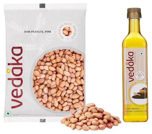 Vedaka Cold Pressed Sesame (Gingelly) Oil Bottle 500ML100% Pure unadulterated oil ensured by the fatty acid profiling process extracted through no heat Process to preserve natural goodness.Vedaka Raw Peanuts Pink 1kgVedaka brings to you high-quality raw peanuts. Our peanuts are hygienically packed to retain goodness and undergo stringent and rigorous laboratory tests to meet fssai food safety norms. They contain no artificial flavours or preservatives.