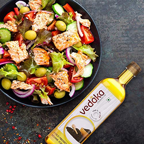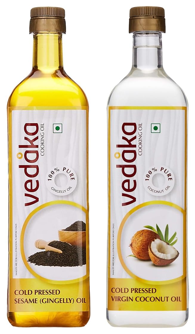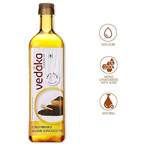 Vedaka Cold Pressed Virgin Coconut Oil Bottle 1LVedaka Cold pressed Coconut Oil is extracted from premium quality coconuts. It has undergone Fatty Acid Profiling to ensure 100% purity and no adulteration. The oil has been hygienically packaged in anti-spillage bottles to avoid leaks during transits. The bottle design allows for both ease of cooking and storage. Vedaka Cold pressed Coconut oil is your companion in making tasty nutritious food everyday. The house of Vedaka your trusted kitchen companion for pulses spices and more now offers a range of Refined Canola & Mustard Oil Cold-Pressed Virgin Coconut Groundnut and Sesame Oil. Whatever your cooking style and your taste preference we have a tasty and nutritious oil variant to meet your cooking needs and to support your lifestyle.Vedaka Sesame (Gingelly) Oil Bottle 1 L (Cheku/Ghani)100% Pure unadulterated oil ensured by the fatty acid profiling process extracted through no heat Process to preserve natural goodness.