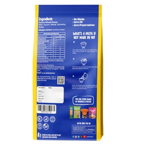 100% Durum Wheat Pasta - Penne - Zero Preservatives - No Maida - Just Boil - 500g - Yu