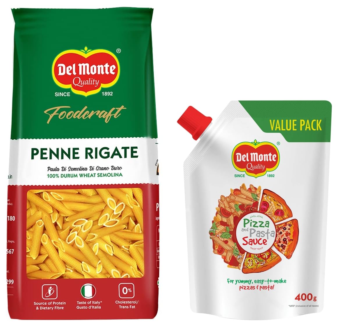 Del Monte FoodCraft Penne Pasta 100% Durum Wheat Semolina 1kgMade using fine quality durum wheat semolina it is ideal for a quick snack as part of a healthy salad in kids’ tiffin-boxes or a complete meal for the family.Del Monte Pizza & Pasta Sauce Spout Pack 400gRich flavourful and multi-purpose pizza and pasta sauce to whip up delectable pizzas and pasta right in your kitchen! Now in an easy-to-handle spout pack that offers great convenience and value-for-money.