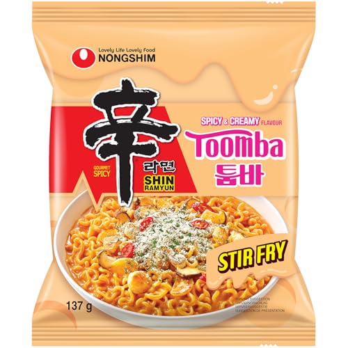 Nongshim Shin Ramyun Stir Fry Toomba - Spicy & Creamy Flavor is the perfect noodle dish for those craving a combination of heat and creaminess. Featuring premium wheat flour noodles and a unique creamy sauce that perfectly balances the spice this dish delivers an authentic bold flavor with every bite. Quick and easy to prepare it’s ideal for busy lifestyles offering a satisfying and convenient meal in minutes. With a 137g each you can enjoy multiple servings making it perfect for family meals gatherings or stocking up. Imported directly from Korea Nongshim brings you the rich savory taste of Korean-style stir-fried noodles with a delicious twist. Whether for a quick lunch dinner or snack Nongshim Shin Ramyun Stir Fry Toomba offers a flavorful and satisfying option for any occasion.