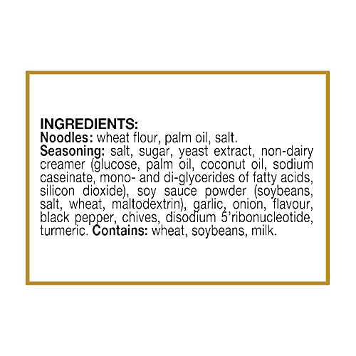 Seasoning: salt sugar yeast extract non-dairy creamer (glucose vegetable fat milk protein) soy sauce powder (soy salt wheat maltodextrin) garlic onion flavor black pepper chives disodium 5’ribonucleotide (from tapioca starch) turmeric. Noodles: wheat flou