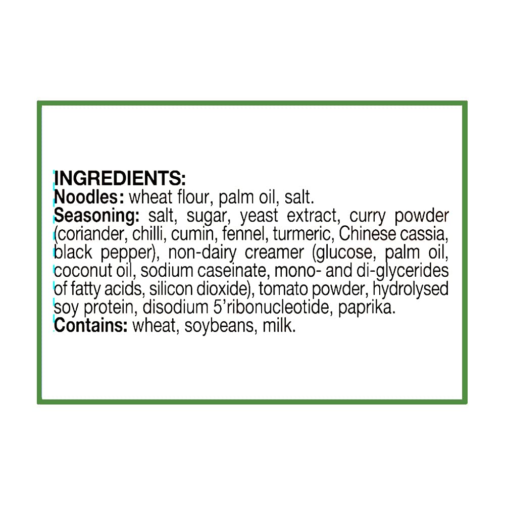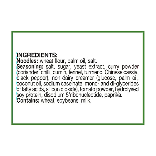 Seasoning: salt sugar yeast extract curry spices (coriander chili cumin fennel turmeric cinnamon black pepper) non-dairy creamer (glucose vegetable fat milk protein) tomato powder hydrolyzed soy protein disodium 5’ribonucleotide (from tapioca starch) papr