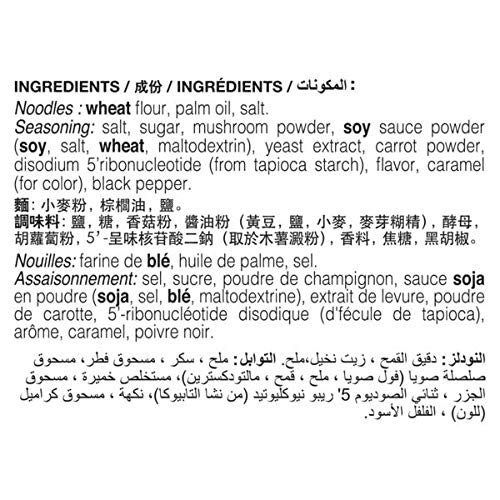 Noodles: wheat flour palm oil salt. Seasoning: salt sugar mushroom powder soy sauce powder (soy salt wheat maltodextrin) yeast extract carrot powder disodium 5’ribonucleotide (from tapioca starch) flavor caramel (for color) black pepper.
