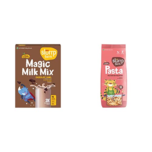 Slurrp Farm High Protein Chocolate Swirl Milk Mix | No Maida No Sugar | Contains Goodness of Millets- Made with Ragi and Jowar | 250gIntroducing Slurrp Farm No Sugar Chocolate Swirl Milk Mix high in protein and made with all natural ingredients. This perfect companion to milk has no added sugar no wheat no preservatives and no chemicals. It is mildly sweetened with jaggery and made with supergrain millets like ragi oats and jowar. The healthy milk mix is rich in protein calcium iron and other essential nutrients necessary for the growth of your child without any added artificial flavors or colors.Slurrp Farm No Maida Macaroni Pasta | Gluten Free & Multigrain | Healthy Pasta made with Brown Rice and Corn | 400gContains No Maida/Wheat No Transfats No Preservatives and No Artificial Flavours. Made with Brown Rice and Corn which are a great source of dietary fibre B-vitamins and essential fatty acids. 100% vegan and gluten free. Low fat with less than 2g per 100g of servings. Just boil for 7-8 minutes toss in a pan with your choice of sauce and your favourite veggies. Made by two mothers for everyone in the family.