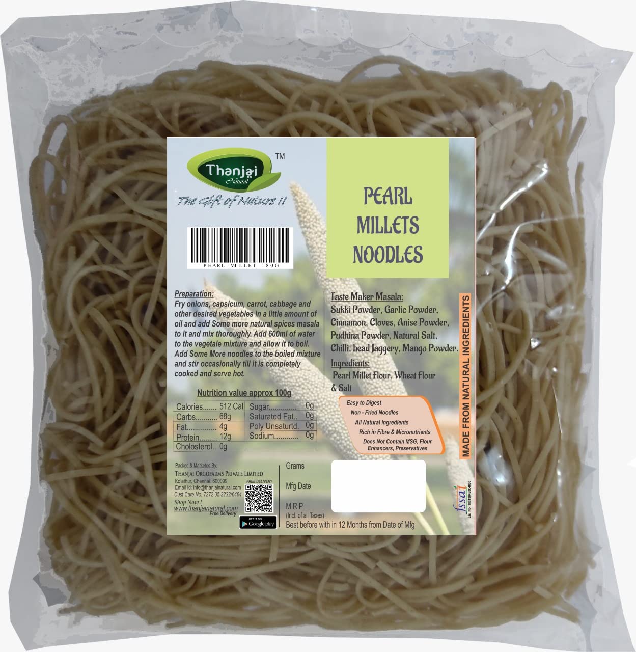 Thanjai Natural Noodles pack is preservatives free; no maida; no artificial flavors and colors; no chemical; delicious tastemaker included in the pack... Easy and Instant - just cook the noodles for 5 minutes drain the hot water and rinse with cold water. Add some veggies of your choice in a little amount of oil and mix (Tastemaker) to it and mix thoroughly. Add the mixed vegetables to the boiled noodles mix well and serve hot to make it a wholesome delicious meal.