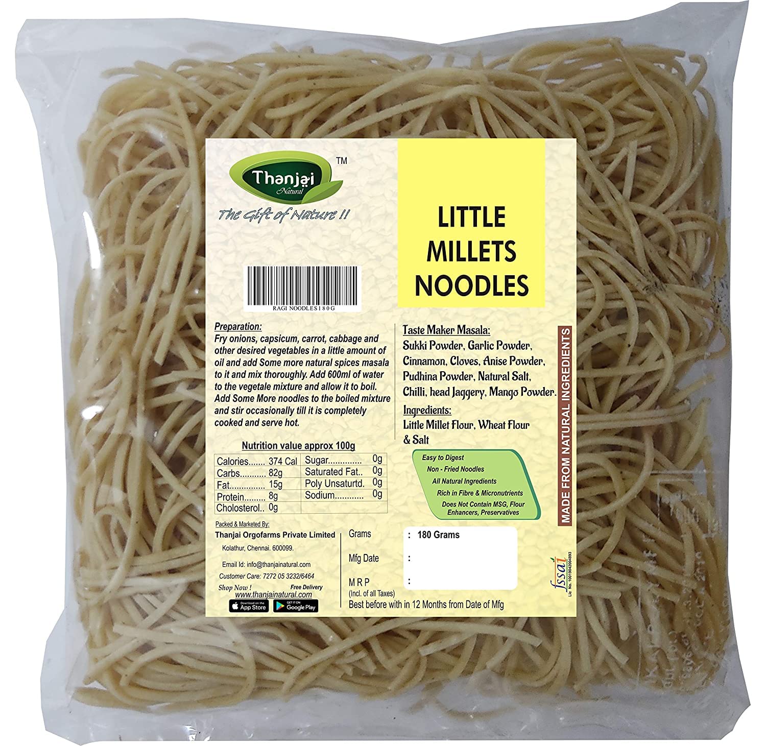 Thanjai Natural Noodles pack is preservatives free; no maida; no artificial flavors and colors; no chemical; delicious tastemaker included in the pack... Easy and Instant - just cook the noodles for 5 minutes drain the hot water and rinse with cold water. Add some veggies of your choice in a little amount of oil and mix (Tastemaker) to it and mix thoroughly. Add the mixed vegetables to the boiled noodles mix well and serve hot to make it a wholesome delicious meal.