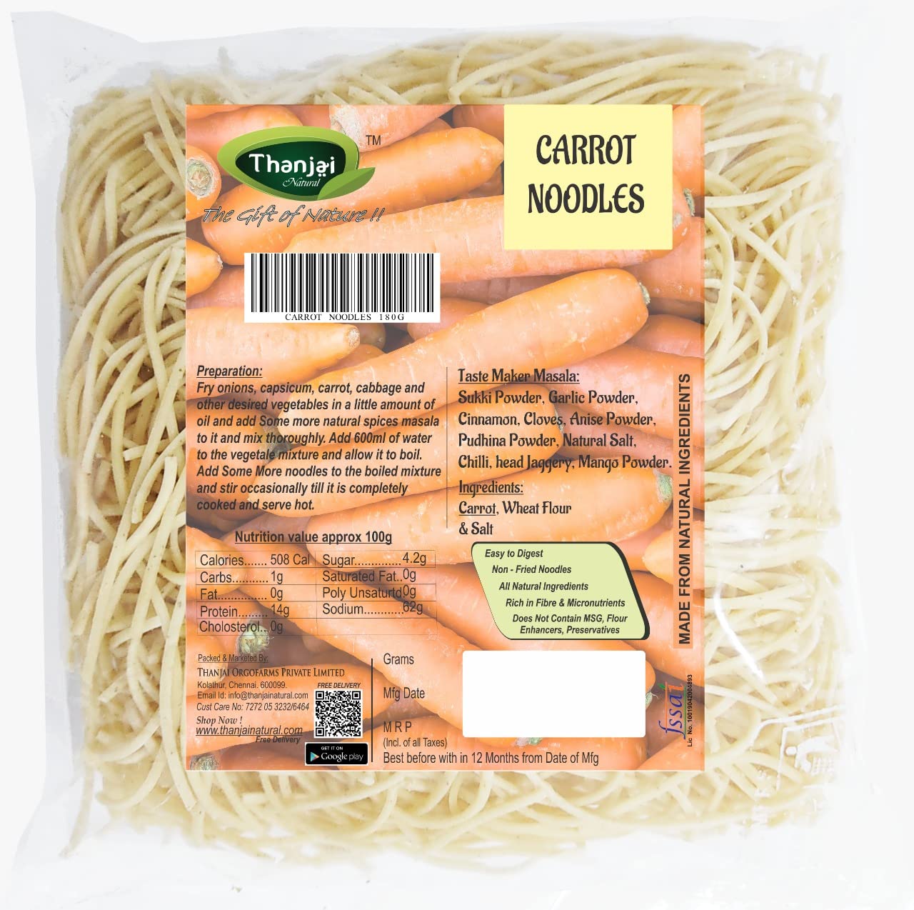 HomeGroceryCookingPasta & NoodlesThanjai Natural Noodles 180 Grams X 4 Varieties (720 Grams) of Homemade Natural Carrot | Karuppu Kavuni | Pearl and Kodo Millets Noodles (No Preservatives No Chemicals No Artificial Extract)