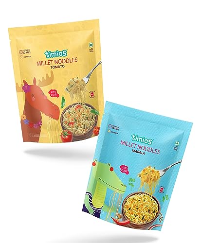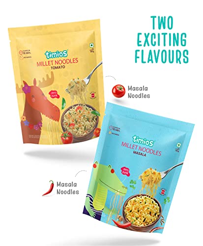 HomeGroceryCookingPasta & NoodlesTimios No-Maida Millet Instant Noodles | Tomato Flavored & Masala Flavored | Not Fried | No MSG | No Preservatives | No Artificial Colors & Flavors | No Trans Fat & Cholesterol | Pack of 2 | 190g Each