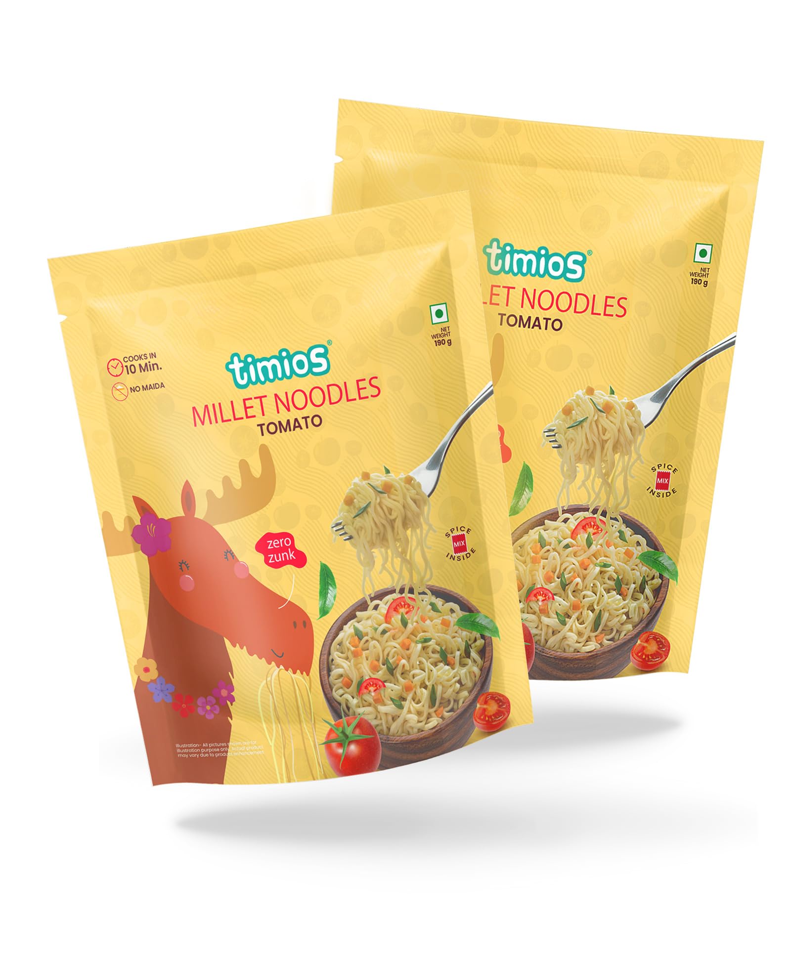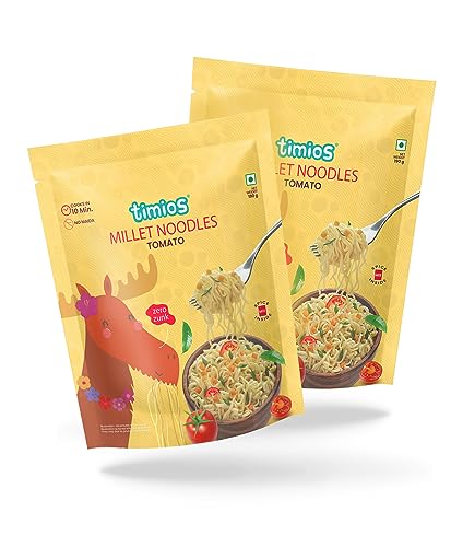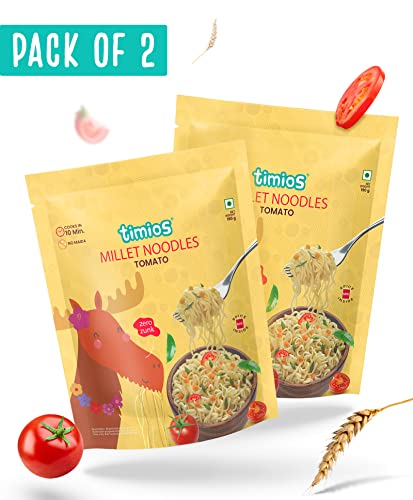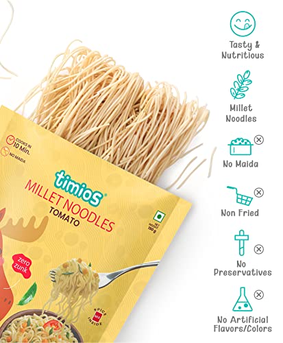 HomeGroceryCookingPasta & NoodlesTimios No-Maida Millet Tomato Flavored Instant Noodles, Not Fried, No MSG, No Preservatives, No Artificial Colors & Flavors, No Trans Fat & Cholesterol, Vegetarian, Pack of 2, 190g Each