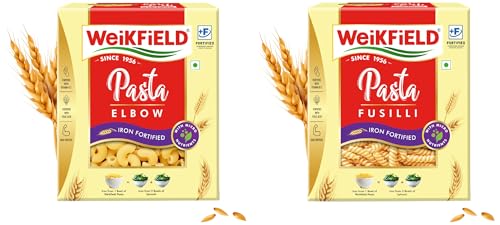 HomeGroceryCookingPasta & NoodlesWeikfield High Protein Fusilli + Elbow Pasta Healthy Pasta Made with 100% Durum Wheat Semolina - No Maida Rich in Protein & Fibre 400g - Pack of 2
