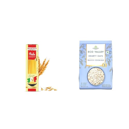 HomeGroceryCookingPasta & NoodlesWeikfield Spaghetti Pasta 100% Durum Wheat Semolina - No Maida 400g & Eco Valley Hearty Oats 1 KG Pouch Rich in Protein and Fibre - Pack of 2