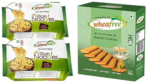 Wheafree Rice Noodles - Pack of 2 (200g each)The product in display is lactose and soy exempt and is made with rice salt potato starch corn starch sago xanthan gum edible vegetable oil. It has a shelf life of 6 months. It comes in a food grade laminated pouch. Keep away from sunlight in a cool dry place. Cooking Directions Quantity- 200gms Serves- 2 Cooking Time- 10 mins - Boil a pot full of water. - Carefully separate the noodle cake into three parts. - Once the water is boiling hot add the noodle cakes into the pot and also add one tbsp of oil to avoid them from sticking together. Now cover the pot with a lid. - Boil the noodles for about 5-7 minutes on high flame and do stir them in between. - Now take off the lid and check your noodles. When you see the noodles floating above the water and on touch they feel slightly undercooked take it off the flame. - Drain the water and rinse the noodles under cold water to remove the starch. Once you are able to see the noodle strands separately stop rinsing it. - Now put the noodles back into the empty pot/ separate bowl and toss them with 1tbsp of oil to prevent clumping. - Heat 1tbsp of oil in a separate pan on medium heat. - Till the time the pan is getting heated up take half a cup of water (175ml) and add to it the Wheafree masala mix that is provided to you in the pack. Now stir the powder thoroughly so that there are no lumps. - Once the pan is heated add the boiled noodles to it followed by the water containing the masala dissolved in it. If you prefer your noodles soupy you can add slightly more water to the pan. - Stir the noodles with a light hand and continue cook it for 2-3 minutes on a medium flame. - Add salt and pepper to taste. - If you like you can add salted/ fresh butter to enhance the flavours. - According to your taste preference you can add to your noodles fresh/ lightly sautéed vegetables and any gluten free sauce that you have.Wheafree Gluten Free Elaichi Cookie 400g Pack | Lactose Free | No Maida | Best Tea Time Snacks | 100% Vegetarian and Wholesome IngredientsWheafree Elaichi Cookies are a favourite tea time snack which is baked to crunchy perfection. Our gluten free cookies are crispy in texture and have a delicately balanced flavour. They go perfectly well with your hot tea coffee and you can also snack them while travelling. Now they are lactose free also.
