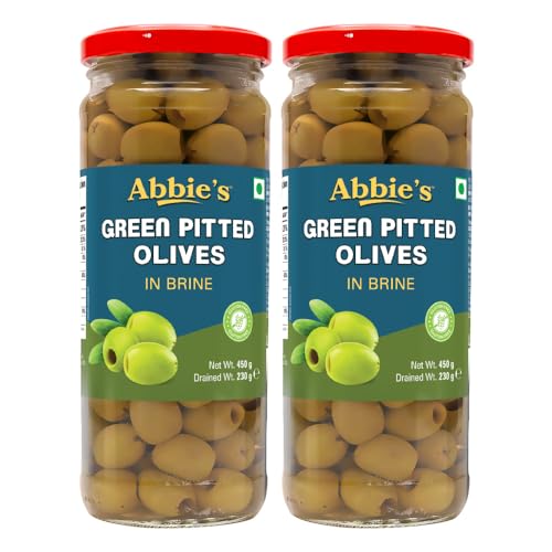 HomeGroceryCookingSalad DressingsAbbie's Green Pitted Olives, 450g, Pack of 2, for Authentic Taste in Cooking, Snacking, Pizzas toppings or Italian Pastas Ingredients.