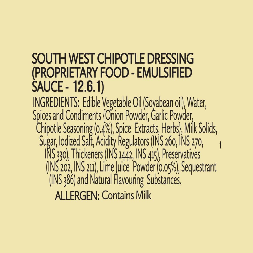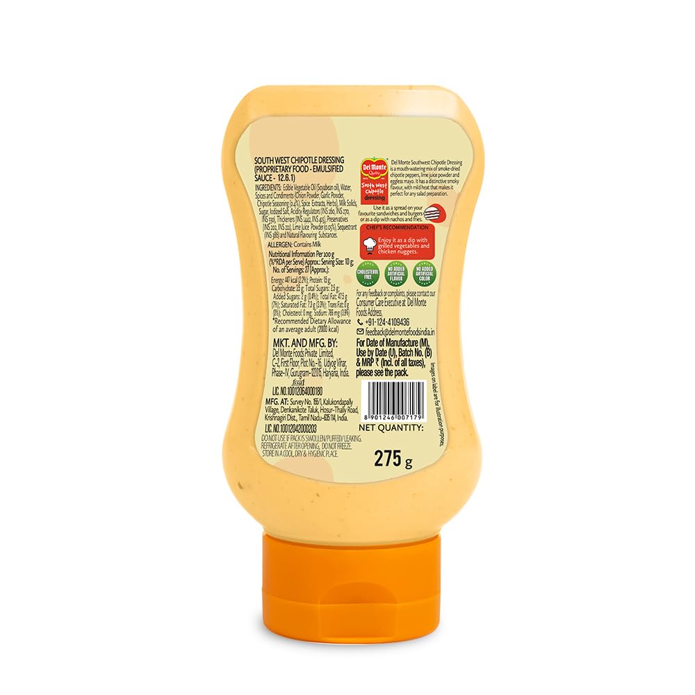 Delmonte Southwest Chipotle is a delicious blend of smoke dried ripe chipotle pepper mustard lime juice garlic onion and mayonnaise. Experience the distinctive smoky flavor with mild spiciness. Use it as a spread on your favourite sandwiches and burgers or dip it with Nachos and french fries. Chipotle Southwest is an authentic Mexican dressing made using Chipotle pepper. Ideal for making Mexican salads.