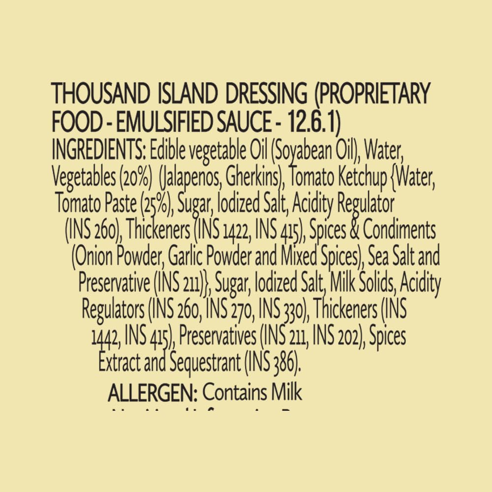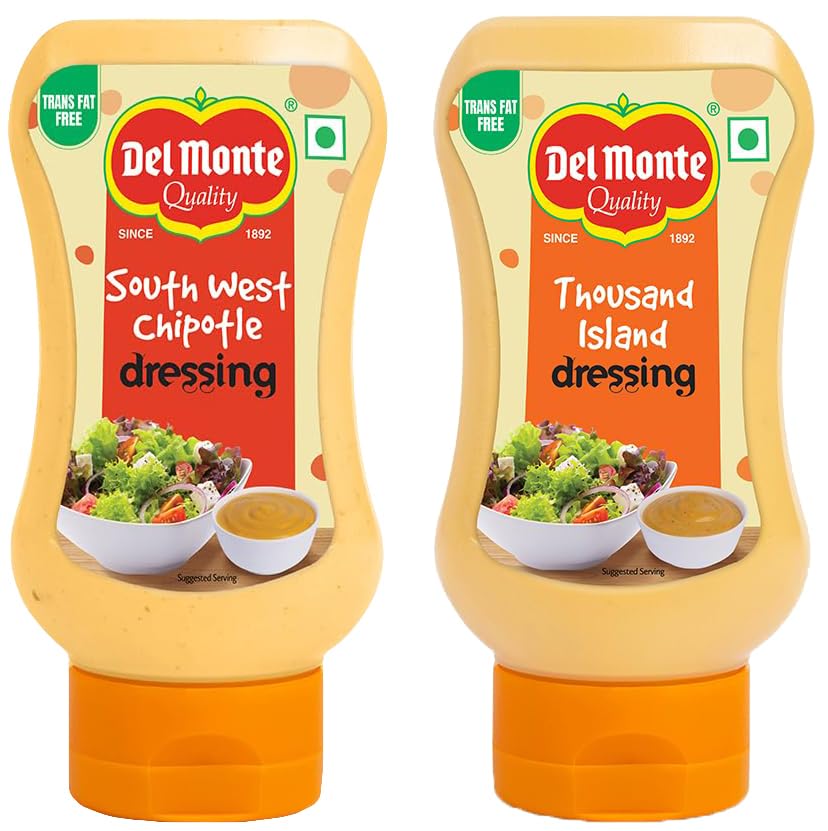 Del Monte Thousand Island Dressing 280gDel Monte Thousand Island Dressing is a magical blend of jalapenos tomato ketchup and eggless mayo. Its sweet and spicy taste combined with its crunchy texture makes it a perfect spread for burgers.Del Monte Southwest Chipotle Dressing 275gDelmonte Southwest Chipotle is a delicious blend of smoke dried ripe chipotle pepper mustard lime juice garlic onion and mayonnaise. Experience the distinctive smoky flavor with mild spiciness. Use it as a spread on your favourite sandwiches and burgers or dip it with Nachos and french fries. Chipotle Southwest is an authentic Mexican dressing made using Chipotle pepper. Ideal for making Mexican salads.