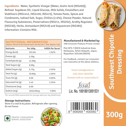 Veeba Chipotle Southwest Salad Dressing 300gOur tagline of incredible taste incredible quality all our sauces have exceptionally low fat content at the same time retaining that perfect balance of taste and flavour. Not just that to ensure unmatched quality all Veeba sauces are manufactured in an iso 22000 certified plant. Customer convenience is the top priority here at Veeba thus all Veeba sauces and dressings come in specially designed ergonomical bottles with an easy to apply dispensing system. For the first time in India such a wide range of tasty and healthy sauces and dressings has been introduced. Using our considerable experience in the food processing industry we have tried to translate our understanding of the changing tastes of the young Indian households into finest products possible. You can now make your favourite sandwich salad or snack in the comfort of your home.Veeba Sauces Barbeque Sauce 330gAll our sauces and dressings have exceptionally low fat content at the same time retaining that perfect balance of taste and flavour. Not just that to ensure unmatched quality all Veeba sauces are manufactured in an iso 22000 certified plant. Customer convenience is the top priority here at Veeba thus all Veeba sauces and dressings come in specially designed ergonomical bottles with an easy to apply dispensing system. For the first time in India such a wide range of tasty and healthy sauces and dressings has been introduced. Using our considerable experience in the food processing industry we have tried to translate our understanding of the changing tastes of the young Indian households into finest products possible. You can now make your favourite sandwich salad or snack in the comfort of your home.