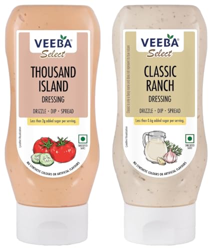 Veeba Ranch Dressing 300gAll our sauces and dressings have exceptionally low fat content at the same time retaining that perfect balance of taste and flavour. Not just that to ensure unmatched quality all Veeba sauces are manufactured in an iso 22000 certified plant. Customer convenience is the top priority here at Veeba thus all Veeba sauces and dressings come in specially designed ergonomical bottles with an easy to apply dispensing system. For the first time in India such a wide range of tasty and healthy sauces and dressings has been introduced. Using our considerable experience in the food processing industry we have tried to translate our understanding of the changing tastes of the young Indian households into finest products possible. You can now make your favourite sandwich salad or snack in the comfort of your home.Veeba Thousand Island Dressing 300gAll our sauces and dressings have exceptionally low fat content at the same time retaining that perfect balance of taste and flavour. Not just that to ensure unmatched quality all Veeba sauces are manufactured in an iso 22000 certified plant. Customer convenience is the top priority here at Veeba thus all Veeba sauces and dressings come in specially designed ergonomical bottles with an easy to apply dispensing system. For the first time in India such a wide range of tasty and healthy sauces and dressings has been introduced. Using our considerable experience in the food processing industry we have tried to translate our understanding of the changing tastes of the young Indian households into finest products possible. You can now make your favourite sandwich salad or snack in the comfort of your home.
