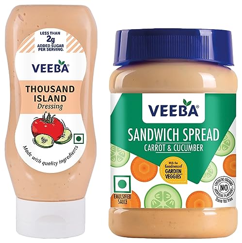Veeba Thousand Island Dressing 300gAll our sauces and dressings have exceptionally low fat content at the same time retaining that perfect balance of taste and flavour. Not just that to ensure unmatched quality all Veeba sauces are manufactured in an iso 22000 certified plant. Customer convenience is the top priority here at Veeba thus all Veeba sauces and dressings come in specially designed ergonomical bottles with an easy to apply dispensing system. For the first time in India such a wide range of tasty and healthy sauces and dressings has been introduced. Using our considerable experience in the food processing industry we have tried to translate our understanding of the changing tastes of the young Indian households into finest products possible. You can now make your favourite sandwich salad or snack in the comfort of your home.Veeba Carrot and Cucumber Sandwich Spread 250g100 percent veg great for sandwiches and rolls.