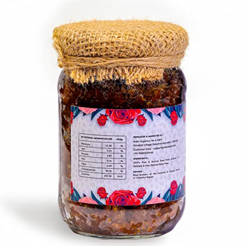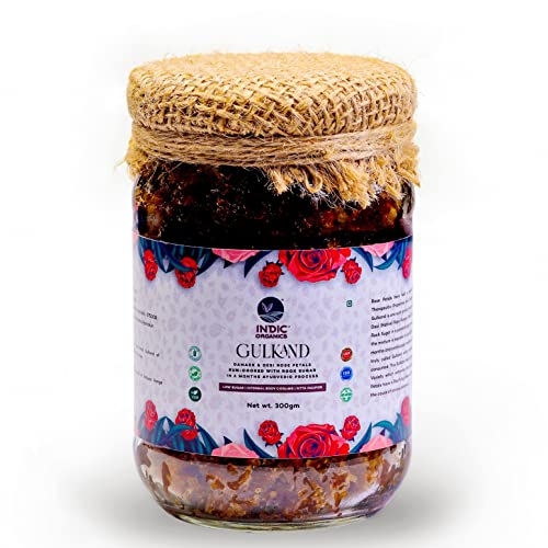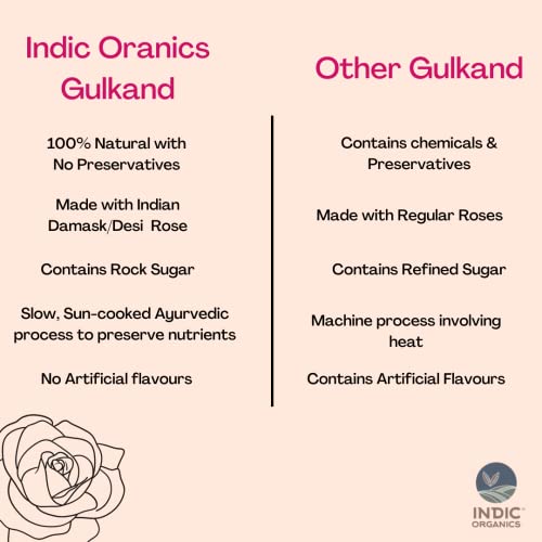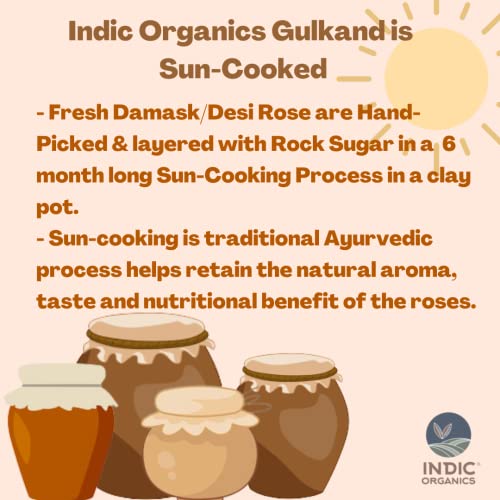 HomeGroceryCookingNatural SugarIndic Organics Gulkand of Desi & Damask Rose Petals Sun-Cooked with Rock Sugar (Mishri) in Ayurvedic Process for 6 Months | Low Sugar | Pitta Pacifier | Internal Body Coolant (Mishri, 300 Grams)