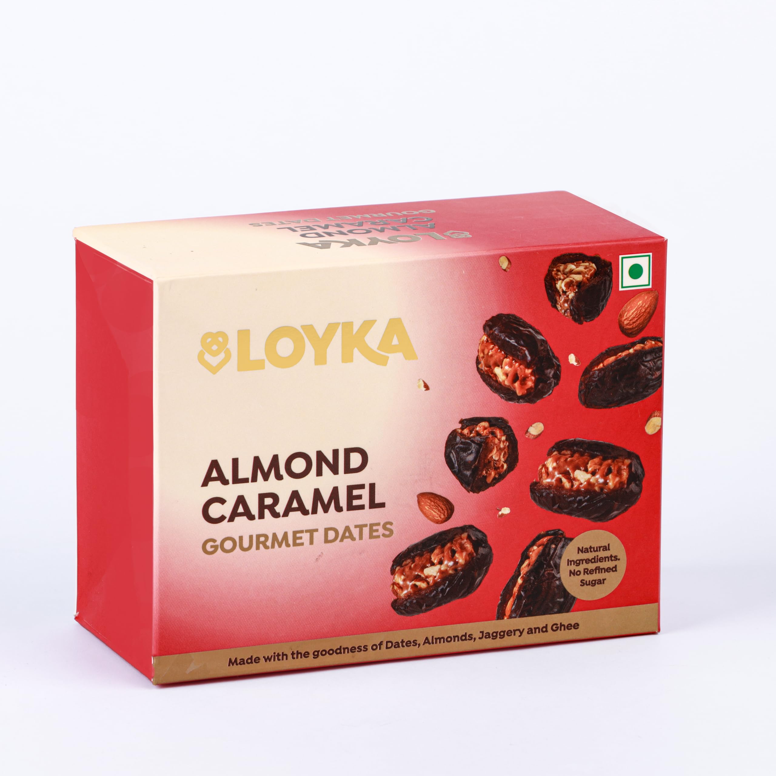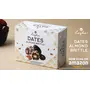 "Introducing our delicious Caramel Almond Dates made with only four simple high-quality ingredients to create a perfectly balanced and irresistible treat. Each bite of our Caramel Almond Dates delivers a satisfying crunch of roasted California almonds complemented by the natural sweetness of dates and the rich buttery flavor of ghee. The filling is then elevated with a delectable layer of caramelized jaggery adding a depth of flavor that will keep you coming back for more. Our Caramel Almond Dates are not only a great-tasting indulgence but also a healthy snack that can be enjoyed guilt-free. Dates are packed with essential vitamins and minerals including potassium magnesium and iron and are a natural source of energy. Almonds are loaded with protein healthy fats and fiber making them a perfect snack to help you stay full and satisfied. The use of ghee a type of clarified butter commonly used in Indian cuisine provides a rich source of healthy fats and imparts a unique nutty flavor to the filling. Lastly jaggery a traditional sweetener made from unrefined cane sugar provides a healthier alternative to processed sugars commonly found in other sweets. Our Caramel Almond Dates come in a 12-piece box making them perfect for sharing with friends and family or as a convenient on-the-go snack. Additionally our product is gluten-free making it a great option for those with dietary restrictions. Whether you are looking for a quick pick-me-up snack a post-workout refuel or a special treat for yourself our Caramel Almond Dates are sure to hit the spot. With their perfect balance of crunchy almonds chewy dates and caramelized jaggery our product offers a delicious and healthy option that is perfect for any occasion. Try them today and discover why our Caramel Almond Dates are quickly becoming a customer favorite!"
