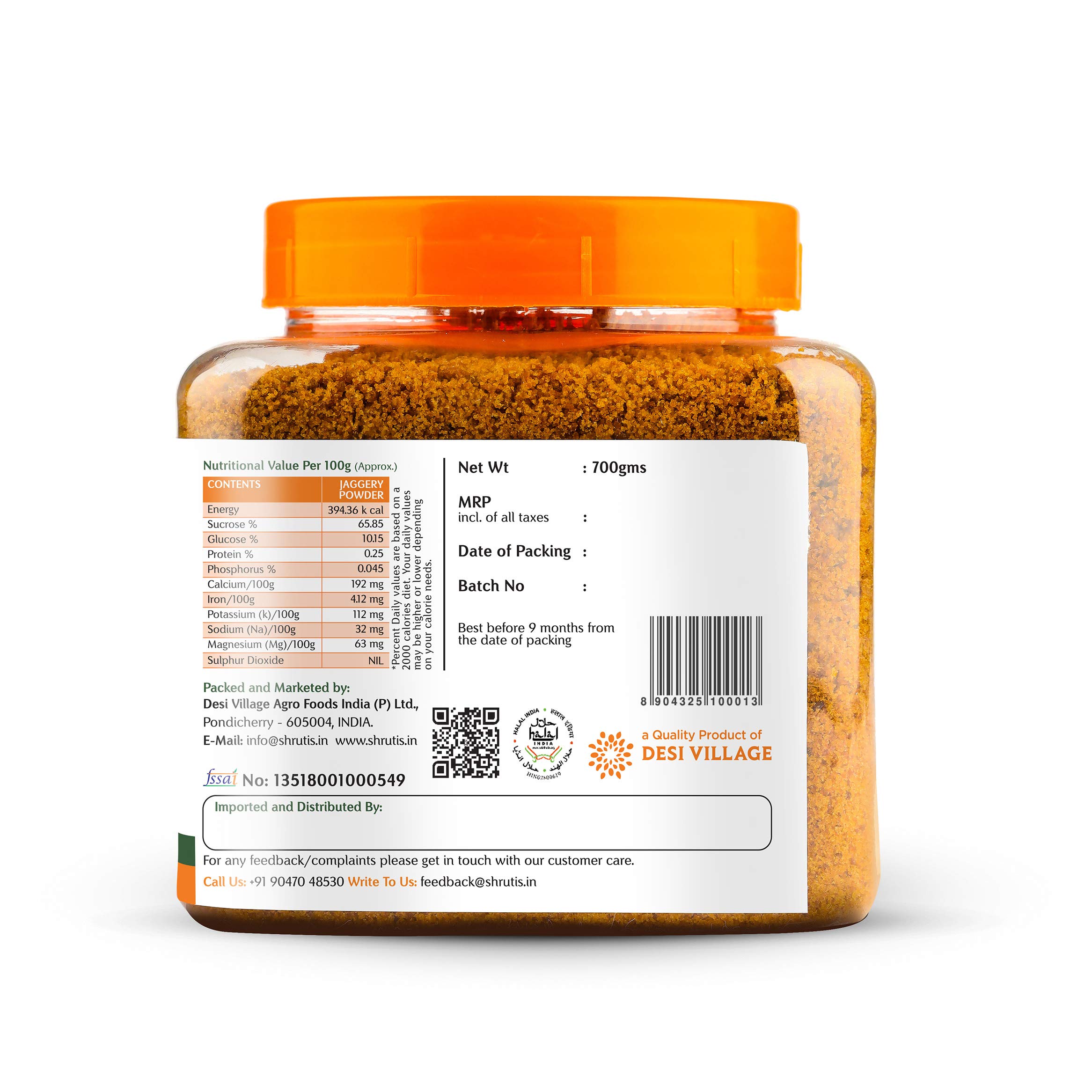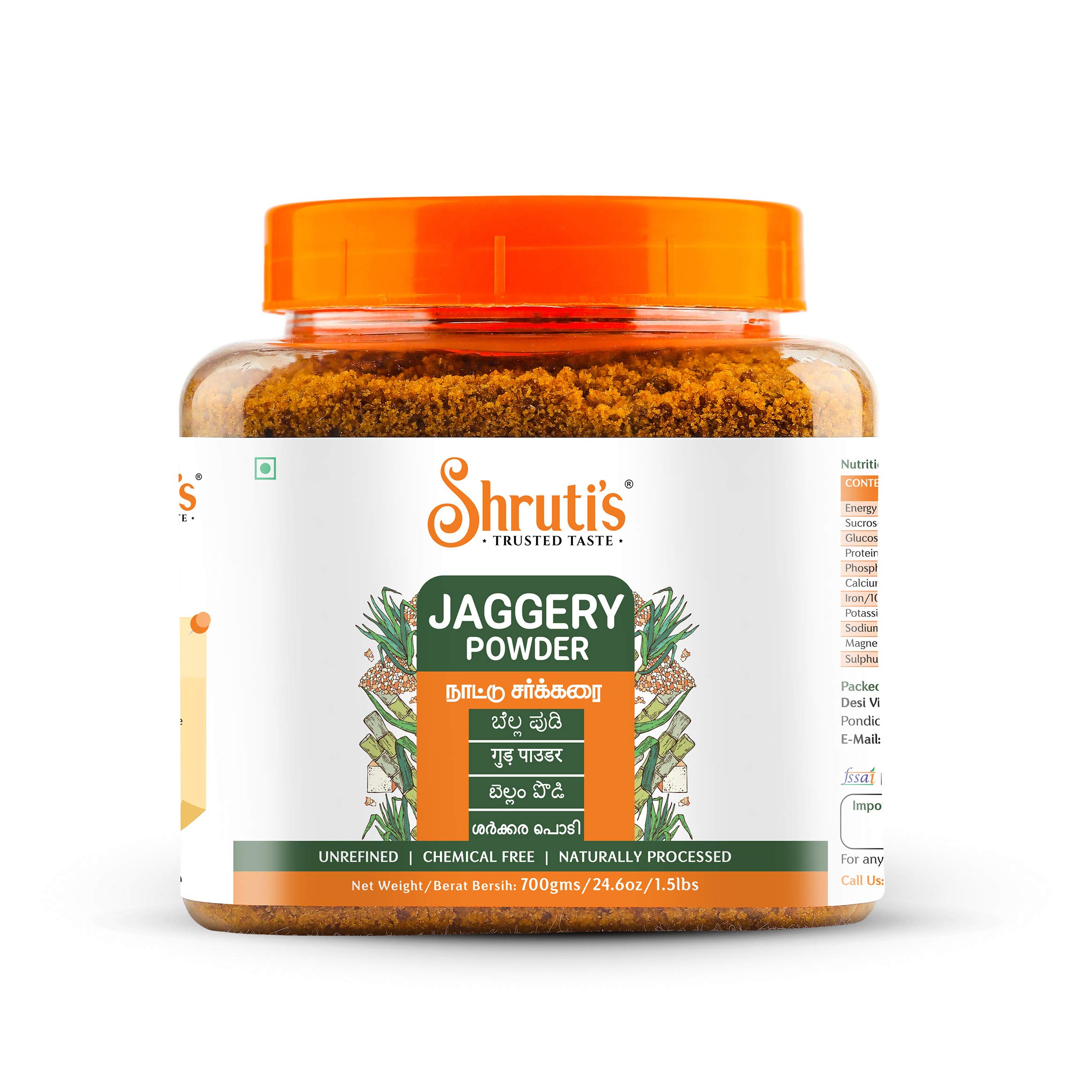 • Molasses is a nutrient-rich by-product of the sugar making process. It is removed from refined sugar but is retained in Shrutis Jaggery Powder.
