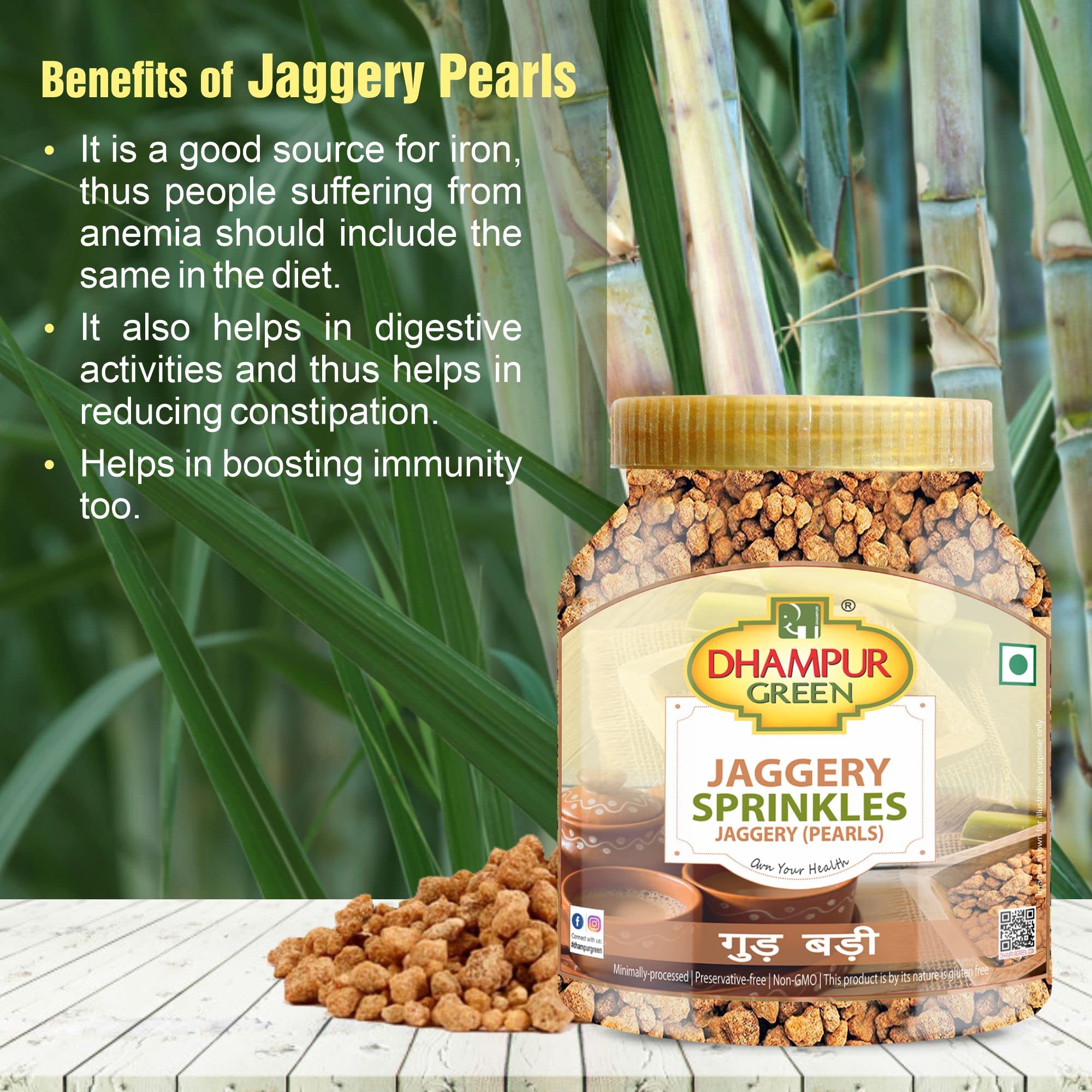 Dhampur Green Jaggery Pearl is made without using any chemical fertilizers/ clarificants or pesticides. Processing is done without using any toxic and harsh chemicals used to clarify cane sugar. It is characterized by a soft texture derived from the process of evaporation of raw sugarcane juice under controlled process conditions with its color varying from yellow to dark brown. Unlike refined sugar coming from chemical processing it retains inherent trace minerals and vitamins and hence is a healthy and nutrient-rich sweetener. Jaggery is undoubtedly one of the quintessential ingredients for making most of the Indian festive sweets. But since jaggery (gur) was available only in wintertime but the demand was year-round we had to find a way to keep our customers happy! Hence we came up with a solution for all our patrons- in the form of Jaggery Powder. Jaggery Pearl (Nattu Sakkarai/ à¤à¥à¤¡à¤¼ à¤à¤¾ पाà¤à¤¡à¤°) is available year-round is easy to handle mess-free and finds an easy way to slip into all traditional recipes! Enjoy Jaggery Pearl from the house of Dhampur Green: the home of Gur and all specialty sugars! Our Desi Shakkar/ Muscovado sugar Purifies blood prevents throat and lung infections and helps combat pollution ill-effects. You will fall in love with our this golden sweetener nothing ever will be able to match the taste and experience.