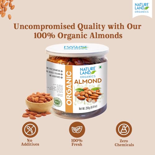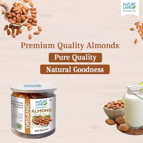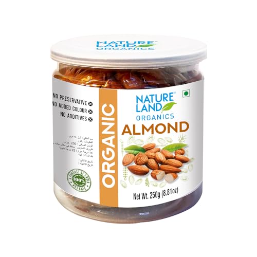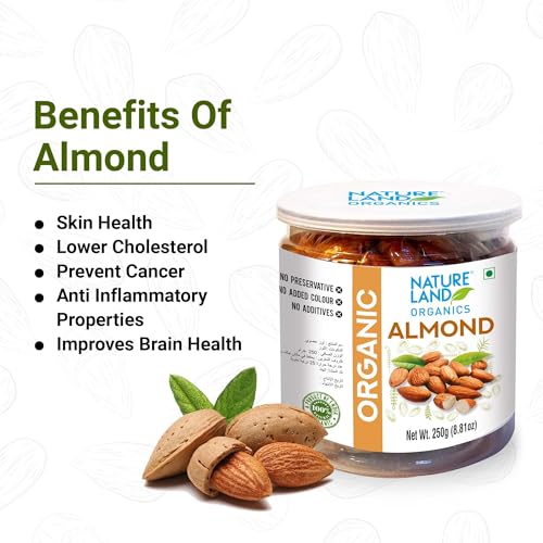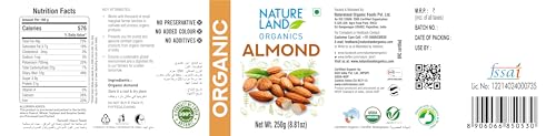 Natureland's Organic almonds. The health benefits of almonds include lower blood sugar levels reduced blood pressure and lower cholesterol levels. They can also reduce hunger and promote weight loss. It also helps in maintenance of healthy hair skin care (psoriasis) and dental care since it is a rich source of vitamin E calcium phosphorous iron and magnesium. It also contains zinc selenium copper and niacin. Natureland's organic almonds trace back their origin from the hills of Jammu and Kashmir and valley of himanchal Pradesh these almonds sourced from the organic grown selected trees after three years of planting the trees and green almonds are de shelled to give you the best quality of non pasteurized shelled almonds. Best organic grocery and gourmet.