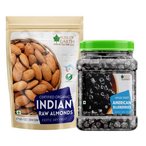 Bliss of Earth Certified Organic Almonds are highly nutritious and rich in healthy fats antioxidants vitamins and minerals. like any other nuts almonds are bursting with nutrition. in fact almonds amy be most nutrient-rich tree nut available today. adding almonds to your diet is a smart and tasty move that can pay dividends for life. Bliss of Earth Dried whole blueberries are handpicked from the united states of america. these berries are natural and delightful dried berries having a sweet flavour and they are succulent & nutritious. Blueberries are rich in a flavonoid called "anthocyanin" which has many health benefits. unlike many other dry fruits these berries are extremely versatile in their use. dried blueberries are a culinary ingredient that will help you produce a variety of great dishes.