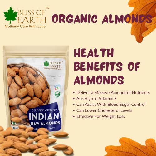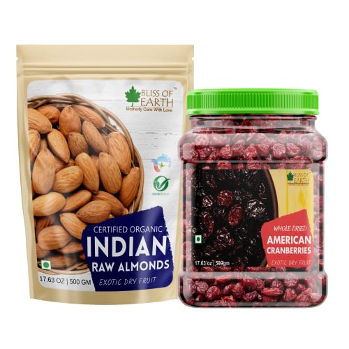 Bliss of Earth dried Cranberries are handpicked from the United States of America. These berries are natural and delightful dried berries that are an excellent source of antioxidants. Also rich in Vitamin K & C and fibre cranberries offer a daily dose of nutrients. Unlike many other dry fruits these berries are extremely versatile in their use. dried cranberries are a culinary ingredient that will help you produce a variety of great dishes.Bliss of Earth Certified Organic Almonds are highly nutritious and rich in healthy fats antioxidants vitamins and minerals. Like any other nuts almonds are bursting with nutrition. In fact almonds may be most nutrient-rich tree nut available today. adding almonds to your diet is a smart and tasty move that can pay dividend for lifes