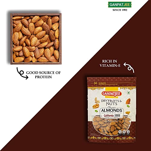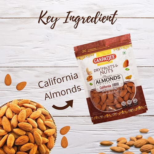 About GanpatjeeGanpatjee believes in superior quality products with the best quality ingredients packed with due care.California Almonds 250 gramsThese are FSSAI approved unshelled naturally processed almonds packed with no artificialities synthetics and preservatives. The crunchier Almonds California nuts satisfy your on-the-go food cravings. It is a perfect nutritious evening snack and the soaked version for a healthy pre-morning breakfast; is distinctively selected based on their origin and quality so that you get the real taste and best nutrients. The calorie-filled almond butter does not contribute to weight gain. On the contrary it contributed to weight loss as the healthy fibre and high protein helped to make the stomach feel full. It is believed to have age-defying properties. Product Specifications:Product: California Almonds Quantity: 250 gmIngredients: AlmondsProduct FeaturesThey are rich sources of vitamins and mineralsIt aids in weight lossServe it in Indian meals like Biryani Pulao Curries etcVegetarian Product! No Artificial colours and No additivesPackage Includes:1*California Almonds 250 gram