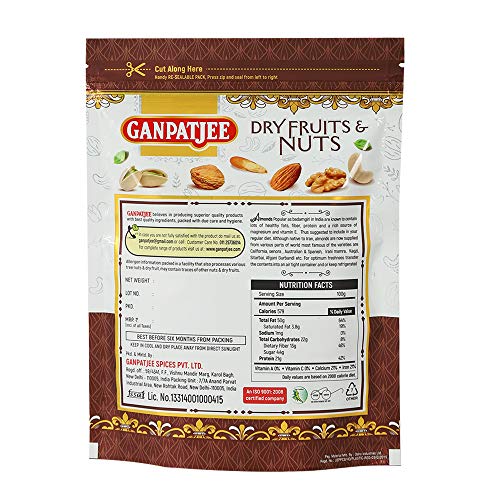 About GanpatjeeGanpatjee believes in superior quality products with the best quality ingredients packed with due care.California Almonds 250 gramsThese are FSSAI approved unshelled naturally processed almonds packed with no artificialities synthetics and preservatives. The crunchier Almonds California nuts satisfy your on-the-go food cravings. It is a perfect nutritious evening snack and the soaked version for a healthy pre-morning breakfast; is distinctively selected based on their origin and quality so that you get the real taste and best nutrients. The calorie-filled almond butter does not contribute to weight gain. On the contrary it contributed to weight loss as the healthy fibre and high protein helped to make the stomach feel full. It is believed to have age-defying properties. Product Specifications:Product: California Almonds Quantity: 250 gmIngredients: AlmondsProduct FeaturesThey are rich sources of vitamins and mineralsIt aids in weight lossServe it in Indian meals like Biryani Pulao Curries etcVegetarian Product! No Artificial colours and No additivesPackage Includes:1*California Almonds 250 gram