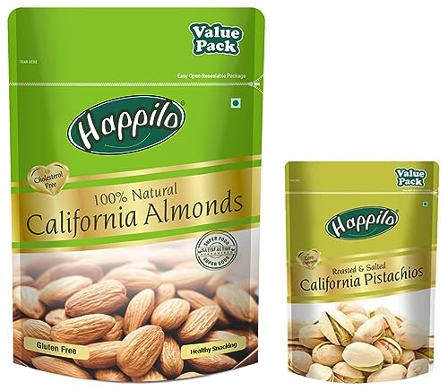 Happilo 100% Natural Premium California Almonds 1kg Value Pack Pouch | Premium Badam Giri | High in Fiber & Boost Immunity | Real Nuts | Whole Natural BadamPerfect for a health snack. Time to be happy lovely & healthy. Gluten free High in protein Almonds High protein dietary fiber no gluten no GMO zero transfat zero cholesterol 100% Real nuts- good for an active lifestyle Lowers harmful cholesterol levels Rich source of omega-3 anti oxidants & vitamins calcium iron & magnesium Hearts best friend improves cardiovascular systemHappilo Premium Californian Roasted & Salted Pistachios 500 gms Value Pack | Pista Dry Fruit Shelled Nuts Super Crunchy & Delicious Healthy Snack | Vitamins & Minerals RichHappilo has travelled the world to get the finest gourmet dry fruits Pistachios are a wonderful fun and tasty snack which are lightly salted. Crack open the shells to treat your taste buds for a snacking sensation.