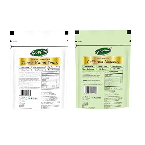 Happilo Premium International Fresh Queen Kalmi Dates 200 gm | 100% Naturally Dried Dates | Sourced from Saudi Arabia | Vegan & No Artificial FlavourHappilo has travelled the world to get the finest gourmet dry fruits. They are one of the most nutritious dried fruits in the world they're a yummy healthy snack. Great for Snacking adding to Cereal Cooking and Baking. High Antioxidants Dietary Fiber No Gluten Non GMO Zero Trans Fat & Zero Cholesterol. Daily need products for a healthy and energetic life. Happilo Zip Lock Pouch with airtight seal to ensure the product is protected and fresh. Quality assured - Happilo products are rigorously tested against the industry's best quality standards.Happilo 100% Natural Premium California Almonds 200 g Dried | Badam Giri | High in Fiber & Boost Immunity | Real Nuts | Gluten Free & Zero CholesterolPerfect for a health snack. Time to be happy lovely & healthy. Gluten free High in protein Almonds High protein dietary fiber no gluten no GMO zero transfat zero cholesterol 100% Real nuts- good for an active lifestyle Lowers harmful cholesterol levels Rich source of omega-3 anti oxidants & vitamins calcium iron & magnesium Hearts best friend improves cardiovascular system