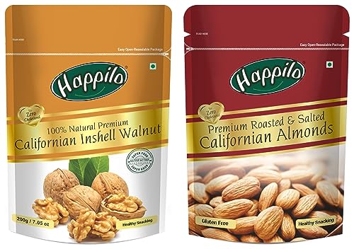 Happilo Premium Californian Almonds Roasted & Salted 200 g | Badam Dry Fruit | High Protein Snack & Super Healthy Crunchy Nuts | Vitamins & Minerals Rich | Freshly Roasted and Lightly SaltedHappilo has travelled the world to get the finest gourmet dry fruits dried fruits nuts berries and dates. Indulge into the gourmet and grocery world of Happily with awesome natural nuts and dry fruits along with the unique dry fruit mixes fusions and flavoured dry fruits healthy seeds and dried berries specially crafted for your taste and health.Happilo 100% Natural Californian Inshell Dried Walnut 200gWalnuts are deliciously healthy & great for snacking baking or cooking. These with shell raw walnut halves are mainly grown in California and Northern India. Eating raw walnuts is one of the easiest things to do to improve your health. Gluten free High in protein Walnuts High protein dietary fiber no gluten no GMO zero trans-fat zero cholesterol 100% natural nuts: Good for an active lifestyle perfect for snacking Low calorie nut low sodium ideal for weight watchers High in anti oxidants slows the ageing process & keeps diseases away Reduces the risk for heart disease cancer stroke diabetes high BP & obesity