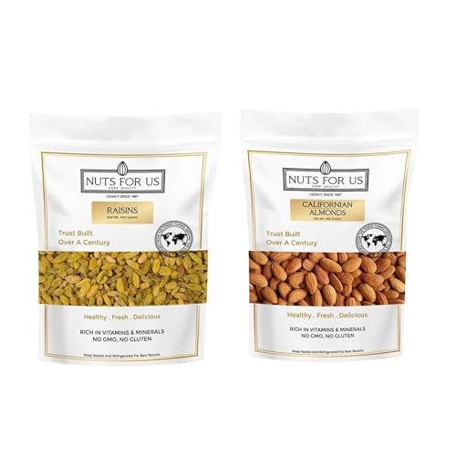 CALIFORNIAN ALMONDS Nuts For Us Californian Almonds are premium quality almonds sourced from the finest farms of California and then hand sorted and packed for our consumers. You can taste the quality in the crunch see the quality in the beautiful golden hue and perfect size. This pack of Californian Almonds is full of nutrients for your consumption. This product is Vegetarian High protein dietary fiber no gluten NON GMO zero transfat zero cholesterol. Almonds are high in magnesium Vitamin E potassium and calcium. An ounce of almonds provide the same amount of calcium as 1/4 cup of milk. Almonds lower LDL or bad cholesterol and lower blood sugar levels thus improving heart health. Almonds even reduce hunger to promote weight loss. Snacking on our almonds will also protect your cells from oxidation and premature aging because of the antioxidant properties in these almonds. Eating almonds also helps in promoting skin hair nails and eye health. Our almonds can be used as a delicious healthy snack or as crunchy toppings for salads oatmeals or parfaits. Keep Refrigerated and Sealed Allergy information: Contains Natural Tree Products. Nuts For Us Green Raisins! Our 400-gram pack of Kishmish is packed with essential nutrients making them a perfect snack for health-conscious individuals. These raisins are not only delicious but also offer numerous health benefits including support for weight loss improved digestion and enhanced bone health. Rich in potassium fiber iron and calcium our green raisins help curb sweet cravings without piling on calories. The high fiber content promotes a feeling of fullness aids in blood sugar control and supports weight management. Additionally their soluble fiber content aids digestion by providing a natural laxative effect while calcium and boron work together to strengthen bones and prevent osteoporosis. Enjoy them as a nutritious snack added to cereals or soaked for optimal benefits!