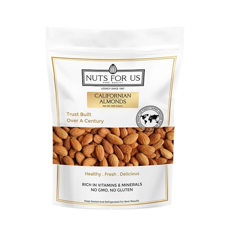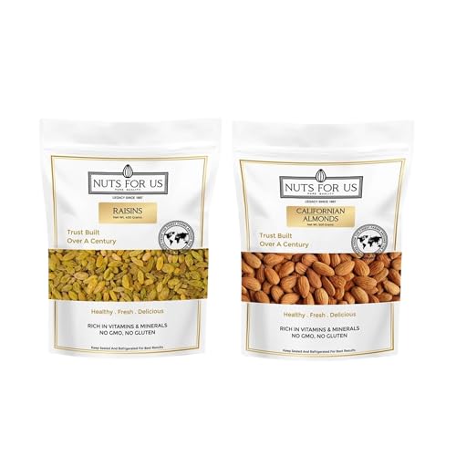 CALIFORNIAN ALMONDS Nuts For Us Californian Almonds are premium quality almonds sourced from the finest farms of California and then hand sorted and packed for our consumers. You can taste the quality in the crunch see the quality in the beautiful golden hue and perfect size. This pack of Californian Almonds is full of nutrients for your consumption. This product is Vegetarian High protein dietary fiber no gluten NON GMO zero transfat zero cholesterol. Almonds are high in magnesium Vitamin E potassium and calcium. An ounce of almonds provide the same amount of calcium as 1/4 cup of milk. Almonds lower LDL or bad cholesterol and lower blood sugar levels thus improving heart health. Almonds even reduce hunger to promote weight loss. Snacking on our almonds will also protect your cells from oxidation and premature aging because of the antioxidant properties in these almonds. Eating almonds also helps in promoting skin hair nails and eye health. Our almonds can be used as a delicious healthy snack or as crunchy toppings for salads oatmeals or parfaits. Keep Refrigerated and Sealed Allergy information: Contains Natural Tree Products. Nuts For Us Green Raisins! Our 400-gram pack of Kishmish is packed with essential nutrients making them a perfect snack for health-conscious individuals. These raisins are not only delicious but also offer numerous health benefits including support for weight loss improved digestion and enhanced bone health. Rich in potassium fiber iron and calcium our green raisins help curb sweet cravings without piling on calories. The high fiber content promotes a feeling of fullness aids in blood sugar control and supports weight management. Additionally their soluble fiber content aids digestion by providing a natural laxative effect while calcium and boron work together to strengthen bones and prevent osteoporosis. Enjoy them as a nutritious snack added to cereals or soaked for optimal benefits!
